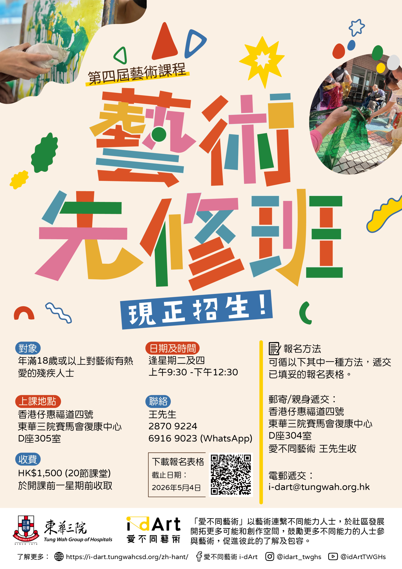 如有兴趣报读「艺术课程先修班」可填妥「先修班课程报名表」(点击下载),于2026年5月4日(星期一)电邮至 i-dart@tungwah.org.hk 递交。